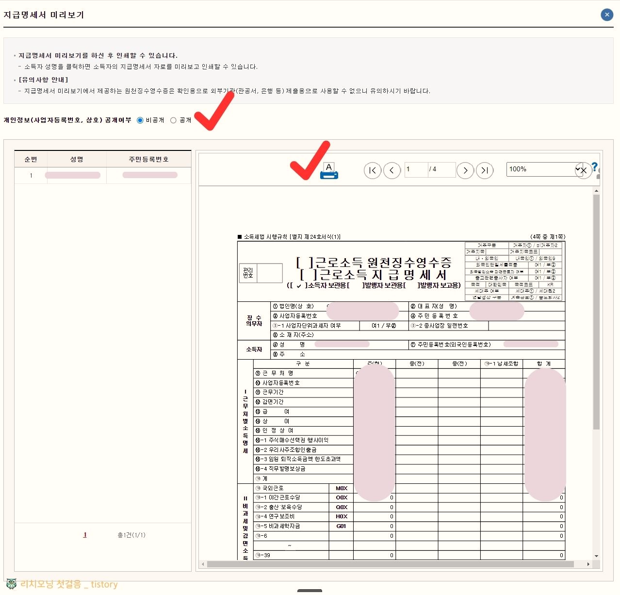 - 회사 제출용이지 주민등록번호는 공개로 체크합니다.