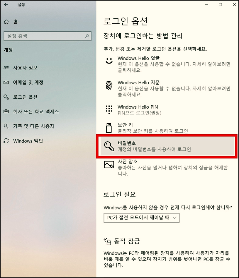 4. 로그인 옵션 메뉴 중에서 중간 쯤에 열쇠 모양 '비밀번호'를 클릭합니다.